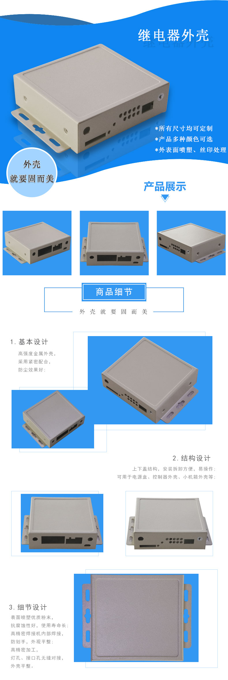 * 適應(yīng)于繼電器外殼,電源盒外殼,串口服務(wù)器金屬鈑金外殼定制加工,數(shù)據(jù)傳輸模塊外殼定做。 * 產(chǎn)品材料:鍍鋅板 * 產(chǎn)品規(guī)格:所有尺寸均可定制 * 產(chǎn)品多色顏色可選,材料批量可訂制 * 產(chǎn)品視情況可按要求修改(如:開孔、噴油、噴粉、絲印等。)