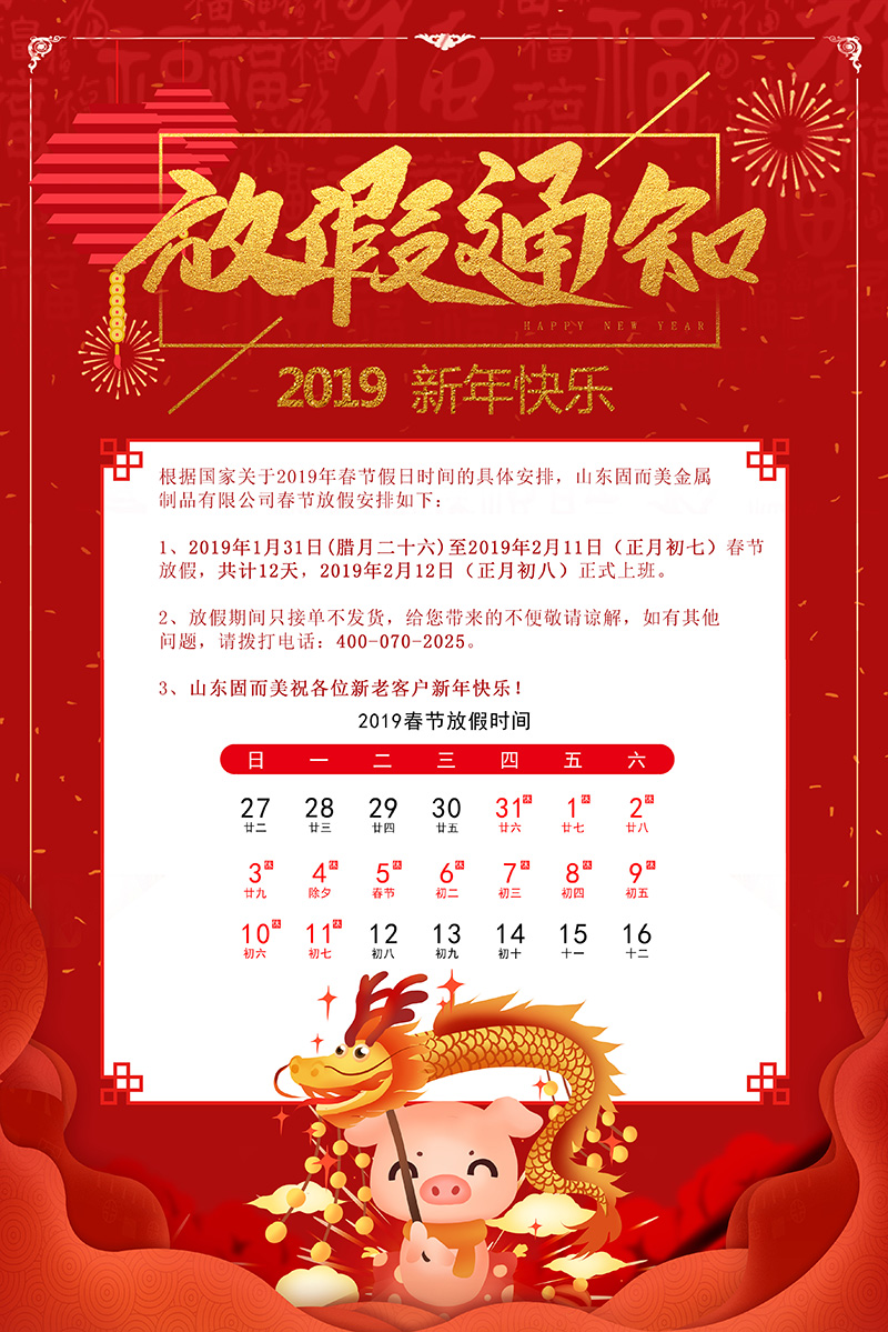 根據國家關于2019年春節假日時間的具體安排,山東固而美金屬制品有限公司春節放假安排如下: